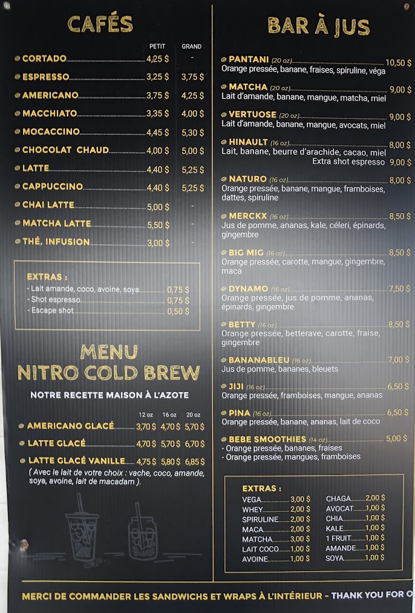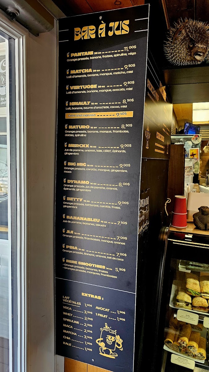 The menu is a celebration of flavors, showcasing a variety of coffee options, including Espresso, Macchiato, and Latte, all priced at CA$5.50. The café also serves delicious breakfast items like their renowned avocado toast and hearty burritos, ensuring a satisfying start to your day.